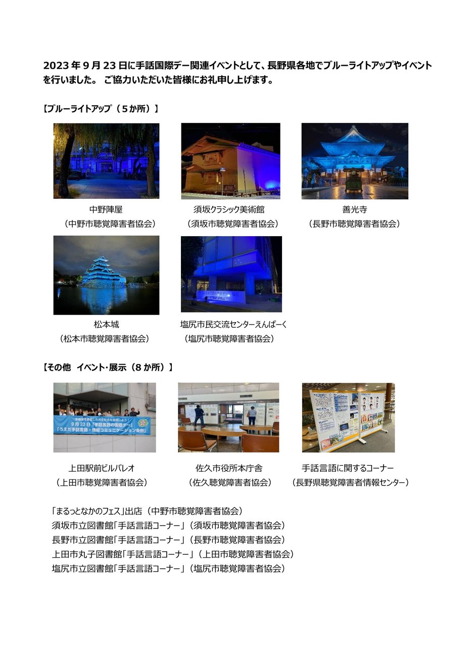 2024年9月23日に手話言語国際デー関連イベントとして、長野県各地でブルーライトアップやイベントを行いました。ご協力いただいた皆様にお礼申し上げます。
