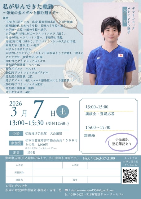 市協会からお知らせ · 2026/01/21 【松本市聴覚障害者協会】2025年度耳の日フェスティバル(3/7) 【松本市聴覚障害者協会】2025年度耳の日フェスティバル申込サイト⇐こちらをクリック 2025年度耳の日フェスティバル .pdf PDFファイル 2.5 MB ダウンロード tagPlaceholderカテゴリ: